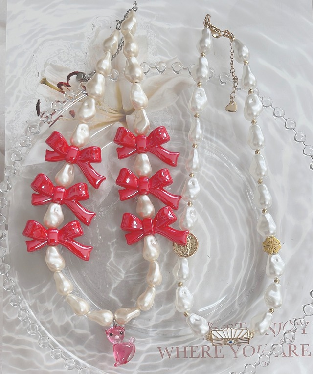 大きめボールチェーンに、デザインが異なるリボンチャームをたくさん付けたネックレスです✨ (長さ) ゴールド:約37cm+アジャスター5cm シルバー:約34cm+アジャスター5cm
