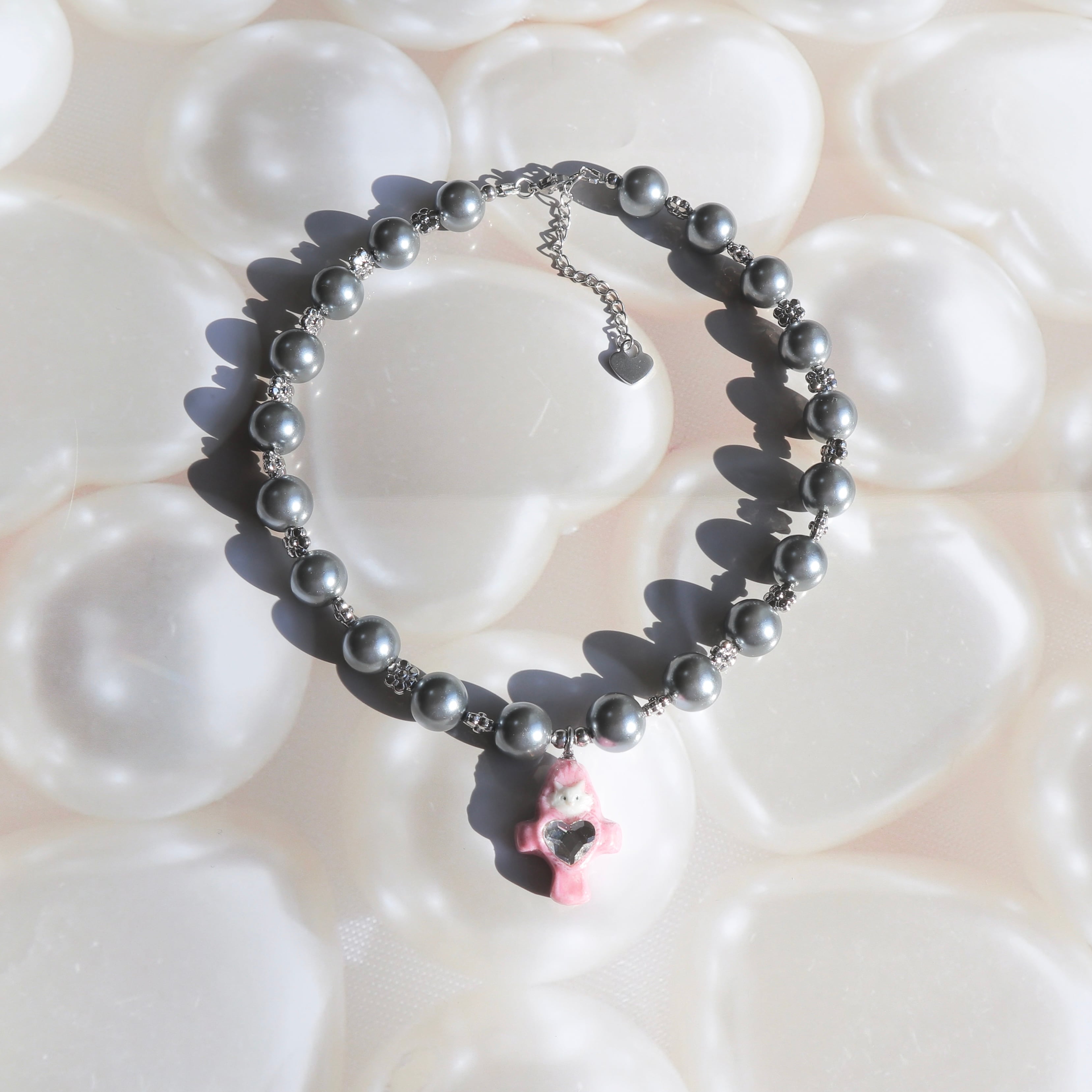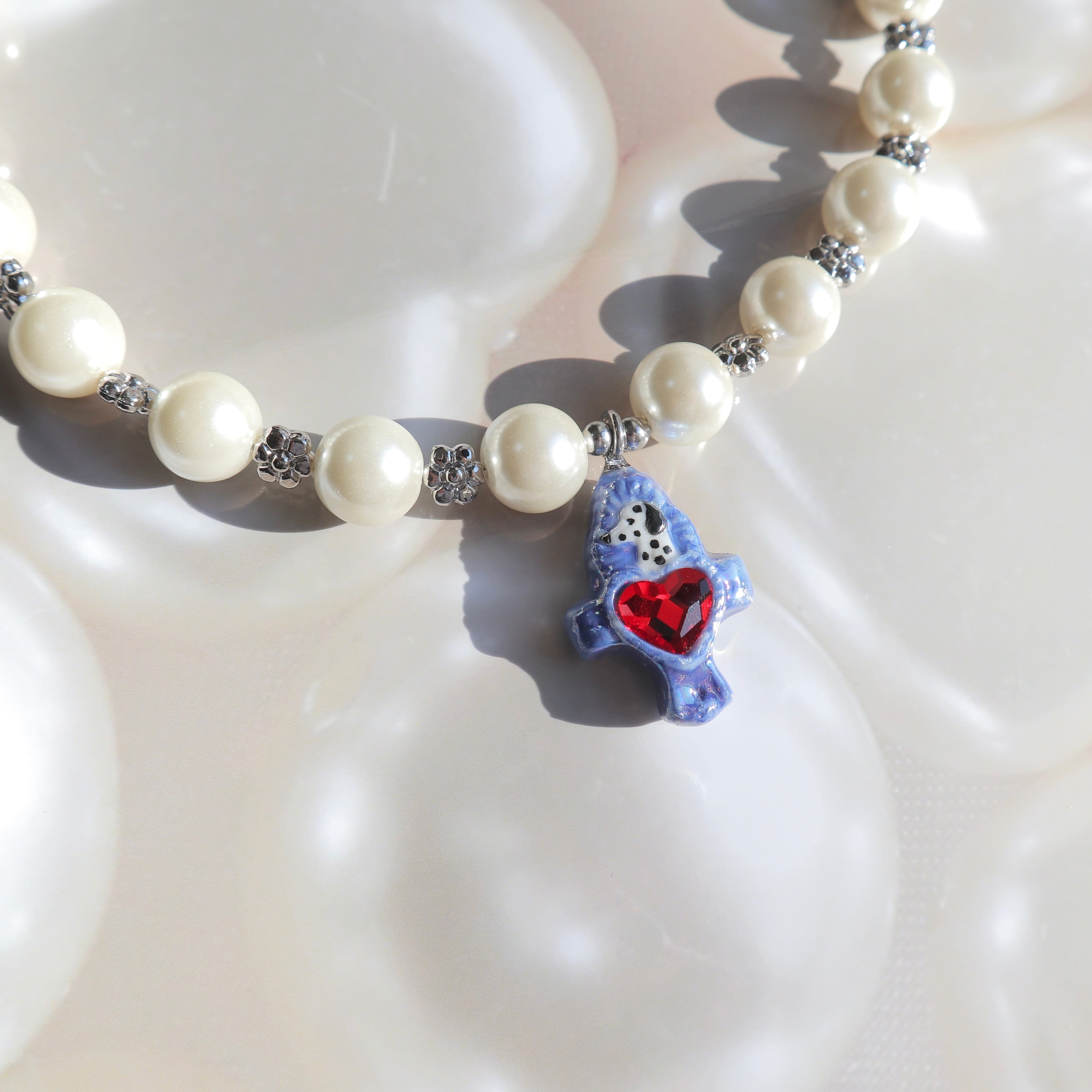 Lovely Charm 22のためにお作りいただいたわんちゃんねこちゃんのクロスパーツに、12mmのパールビーズを使用したパールネックレスを合わせました。